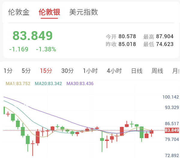 白银从121.48美元高点暴跌27.7%收85.018美元,创1982年以来最大单日跌幅。周一亚市早盘,一度跌只74.623,今年迄今涨超55%。铂金盘中跌22%至2033美元,钯金跌20%至1582美元。
