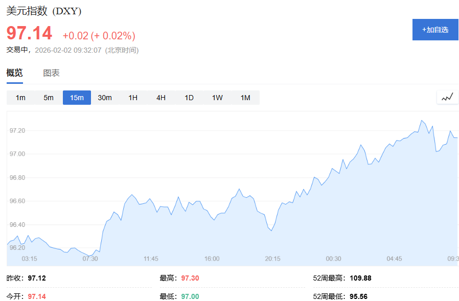 美元指数反弹1%,现报97.14,主因为特朗普提名鹰派凯文·沃什接替鲍威尔担任联储主席,市场解读其将会鹰派降息,是触发市场情绪逆转的直接导火索。此举削弱了市场对未来进一步降息的宽松预期,推动美元指数自四年低点反弹,对以美元计价的黄金构成压力。