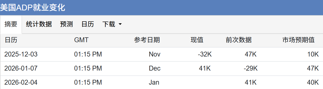 ADP就业报告(2月4日):预期增加4.1万人,若大幅偏离将先行影响市场情绪。