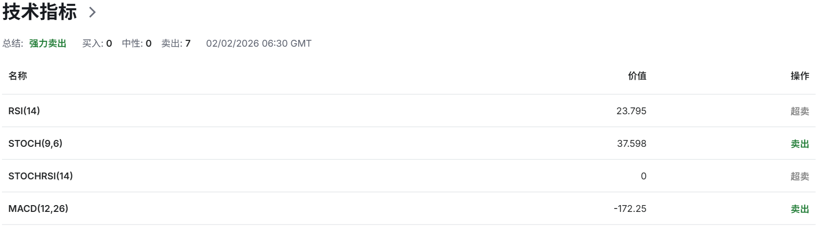 相对强弱指数(RSI)低至23.795,深度超卖,但下行惯性巨大,超卖指标在崩盘中可能持续;