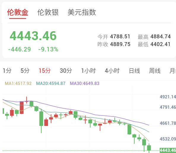 北京时间2月2日14:42,市场已进入“瀑布式”崩盘模式。金价格报4443.46美元/盎司,单日跌幅再达9.13%。