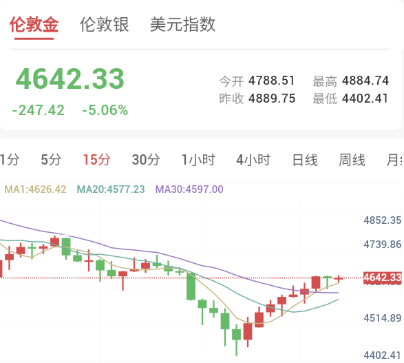 在强大的技术性抛压主导下,现货黄金价格延续跌势,16:53报4642.33美元/盎司,单日下跌5.06%。