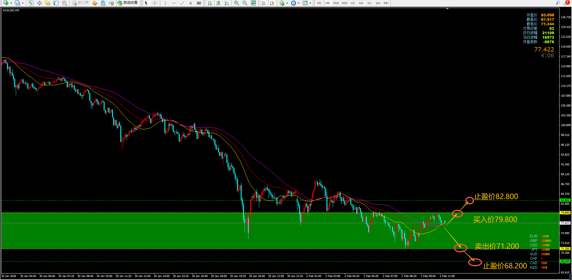 空头条件: 价格向下跌破71.200后,可考虑反手做空。