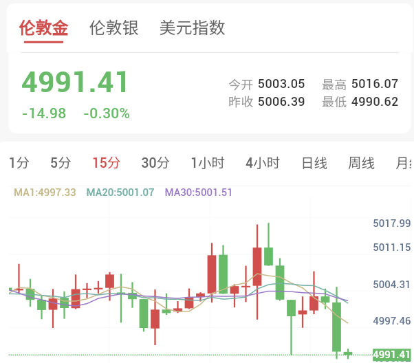 现货黄金周一(3月16日)一度跌破5000美元心理大关,盘中最低触及4967.44美元/盎司,最终小幅收跌0.3%报5006.39美元。