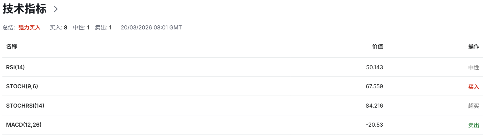随机指标(STOCH)为67.6,处于买入区域,随机RSI(STOCHRSI)升至84.2,进入超买区间,提示短线上涨动能较强但需注意节奏变化;