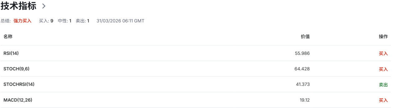 随机指标(STOCH)为64.4,处于买入区域,随机RSI(STOCHRSI)为41.4,处于偏弱水平,短期动能放缓;