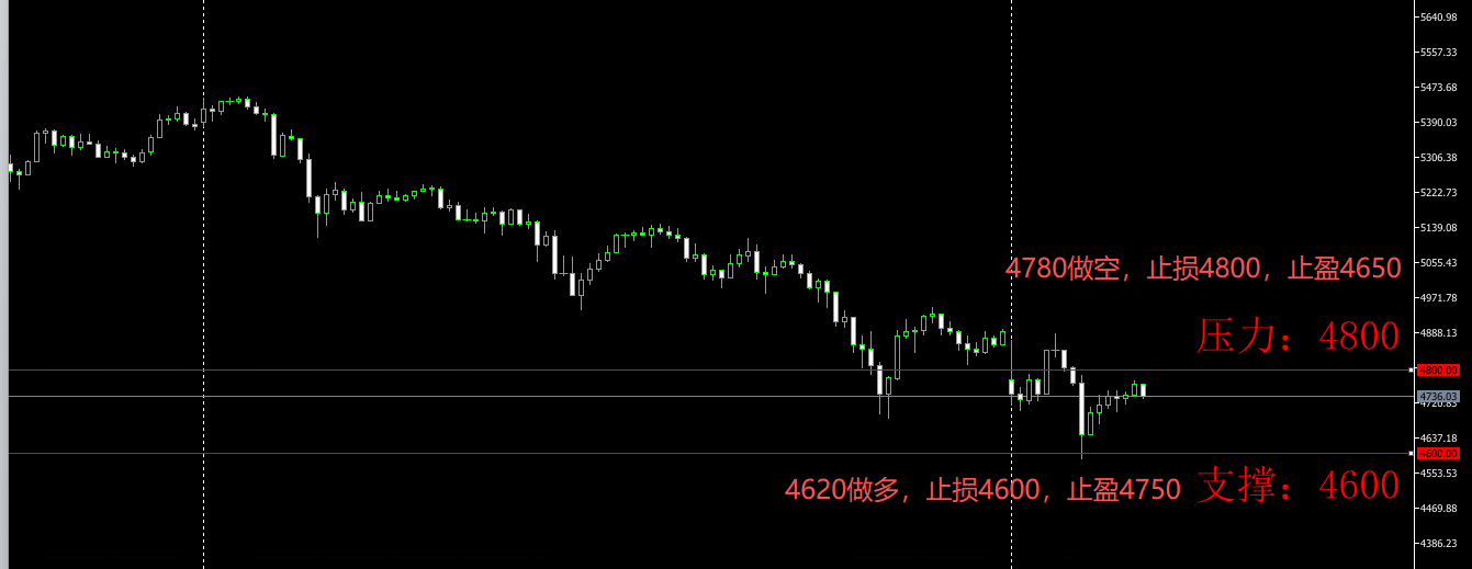 多单:跌破4620.00可以开仓做多,止损设4600.00,止盈设4750.00。